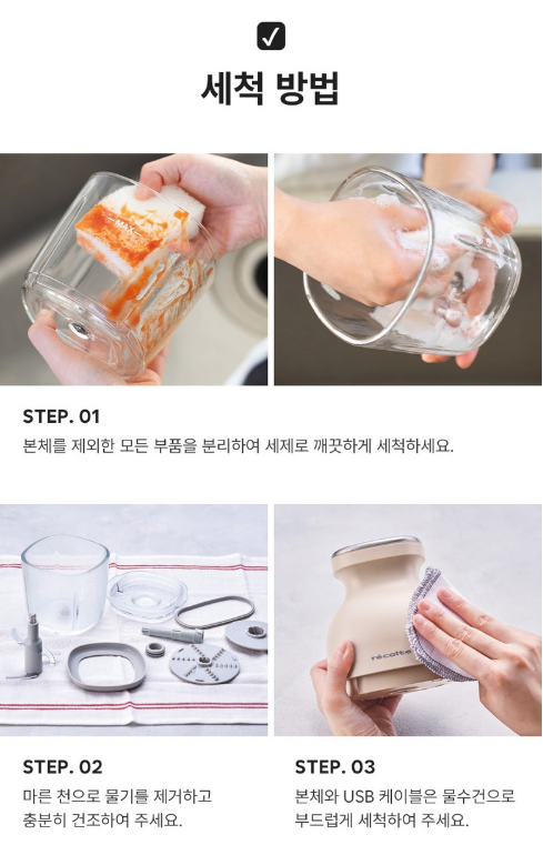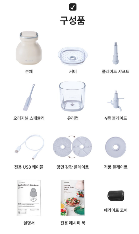 - 구성: 본체 + 칼날 + 용기 + 뚜껑 + 충전 케이블