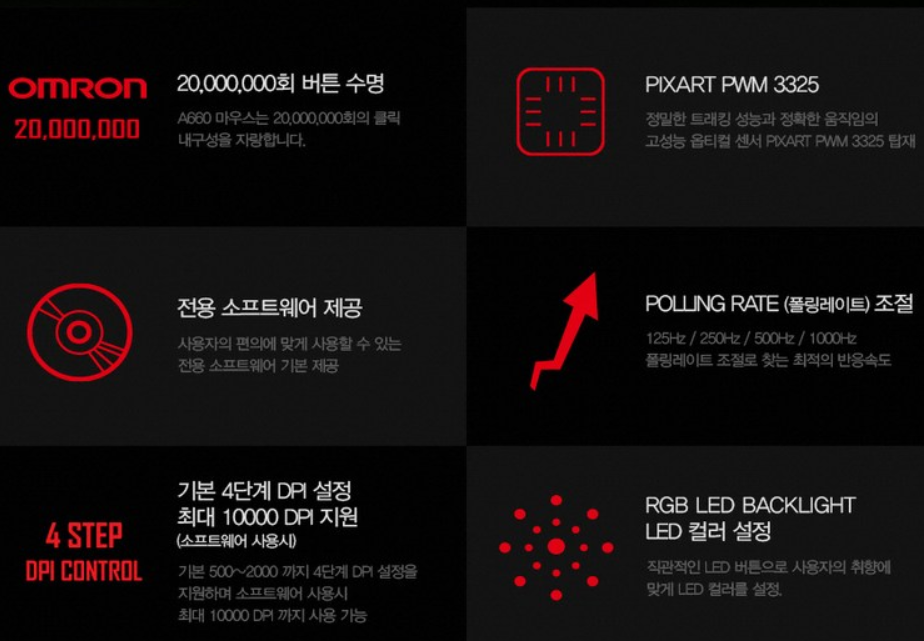 - DPI 커스텀, LED 설정, 매크로 기능 사용 가능
